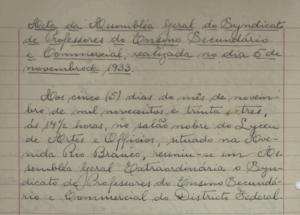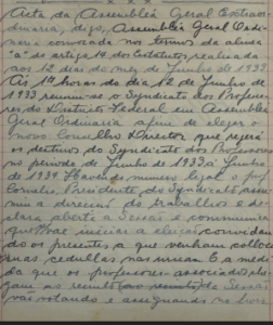 Ata da assembleia geral extraordinária de primeiro de outubro de 1933 Fonte: Arquivo Sede Centro do Sinpro-Rio