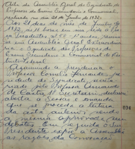 Ata da assembleia geral do dia 21 de junho de 1932 Fonte: Arquivo Sede Centro do Sinpro-Rio