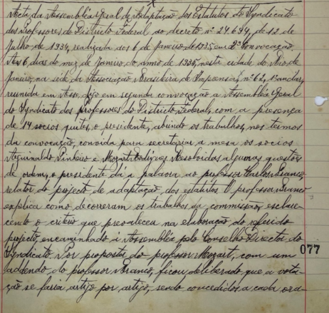 Ata de assembleia geral de adaptação de estatuto, realizada pelo Sinpro-Rio em 06 de janeiro de 1935