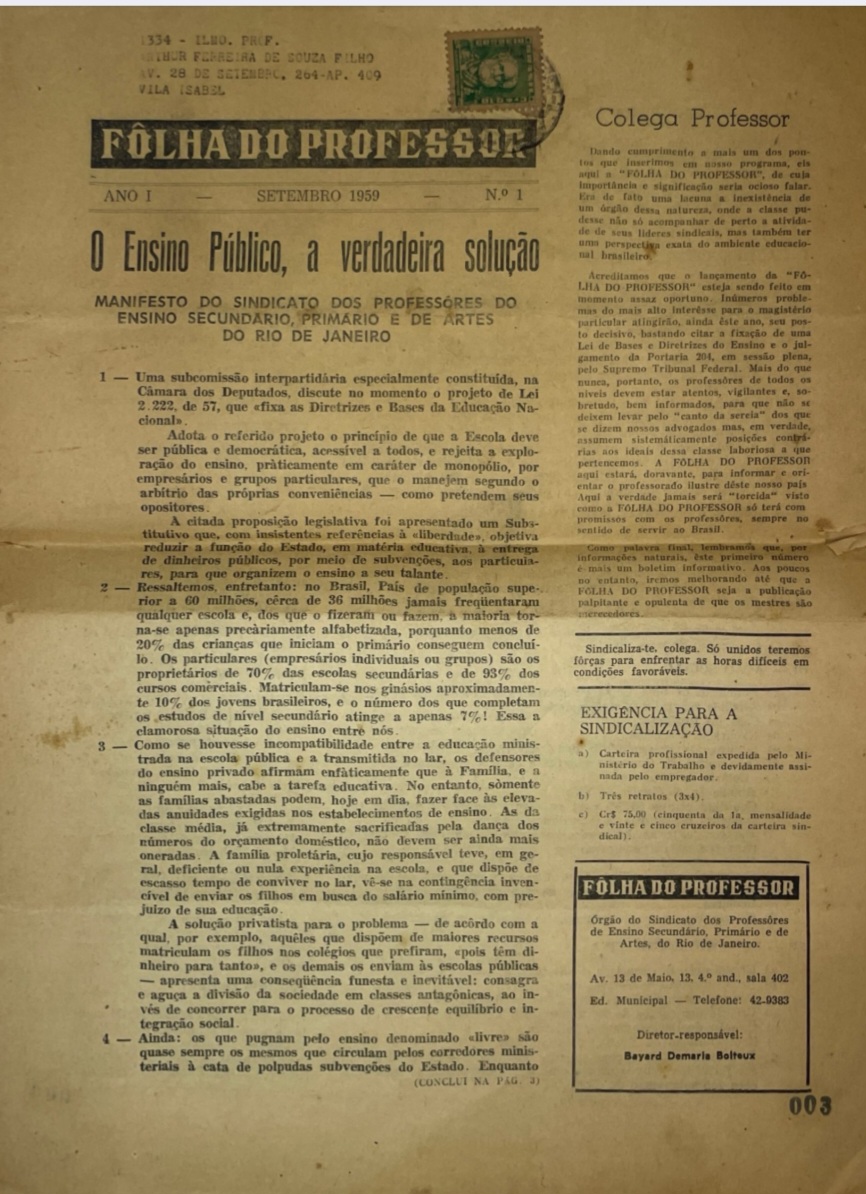 Publicação do primeiro número da Fôlha do Professor, jornal do Sindicato